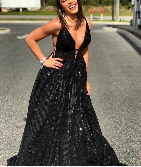 Black Sequins Lace Prom Dresses Sexy Deep V Neck Sleeveless Evening Formal Gowns Vestidos