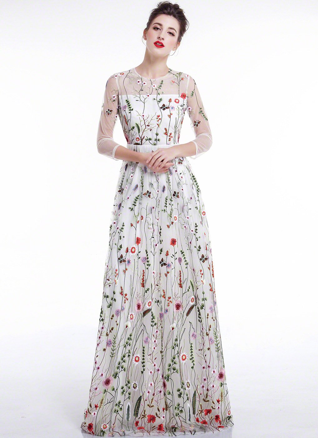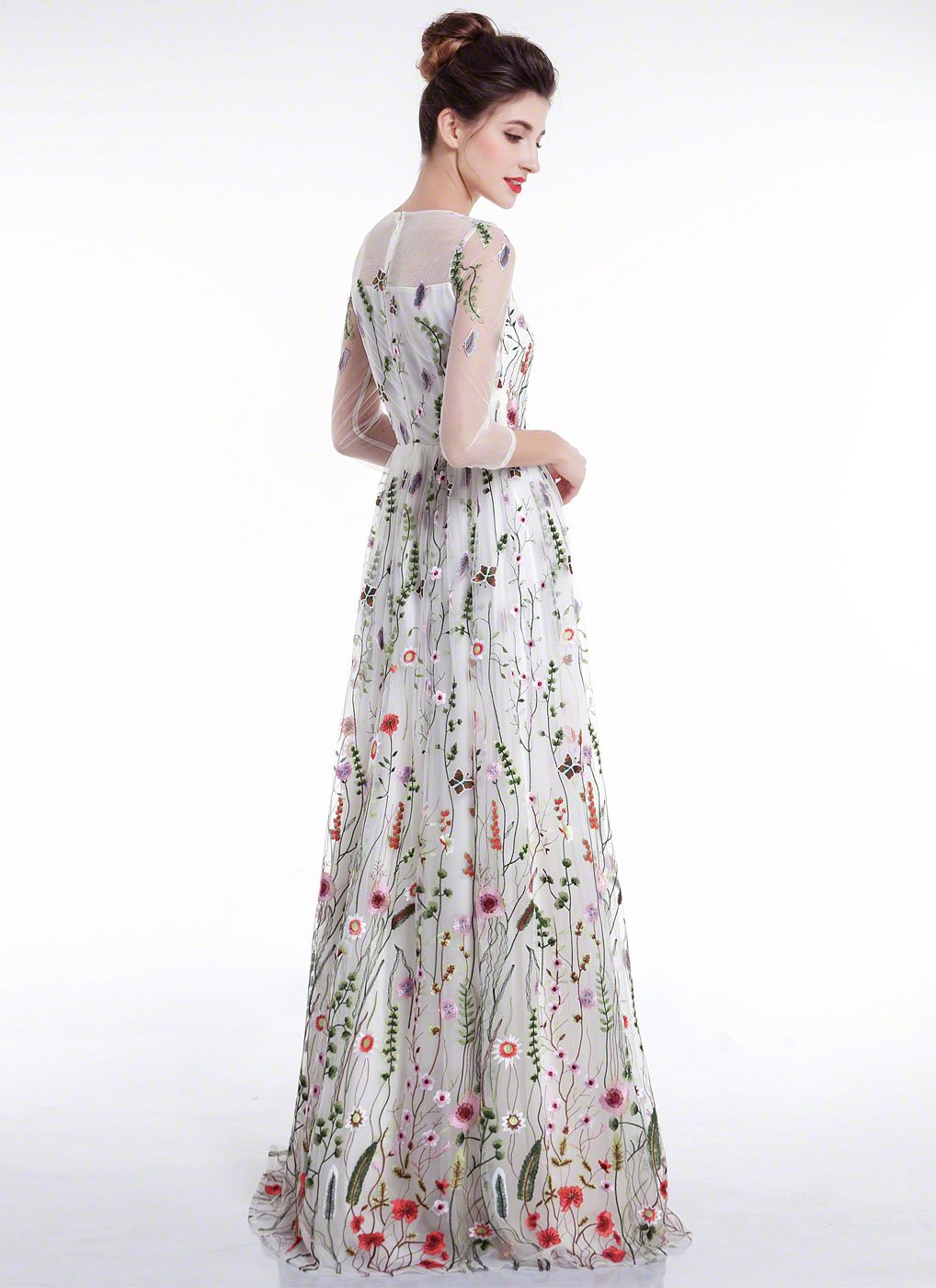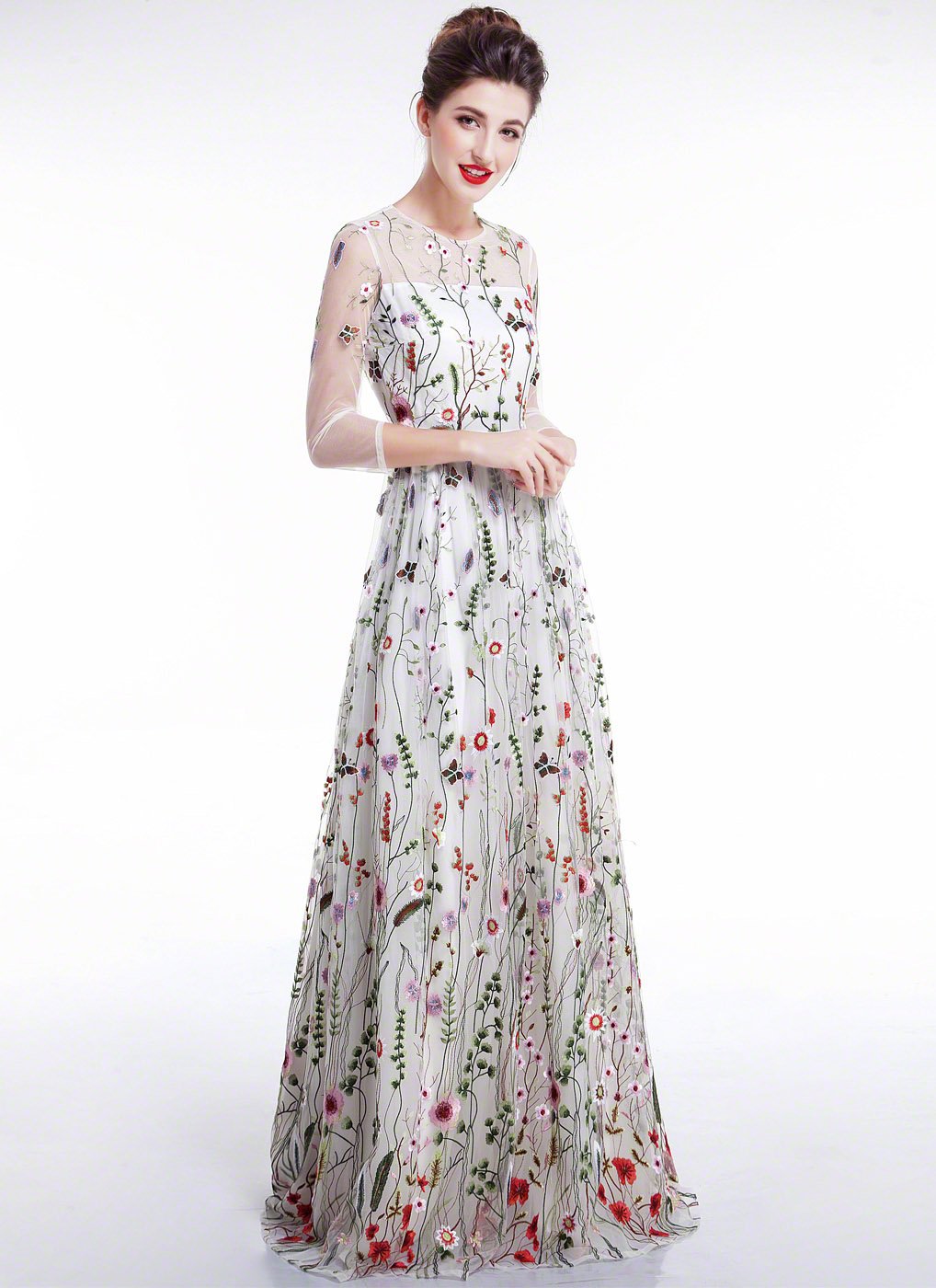 White Prom DressTulle Colorful Floral Embroidery Whimsical Maxi Evening Dress with Sheer 3/4 Sleeves Prom Dress