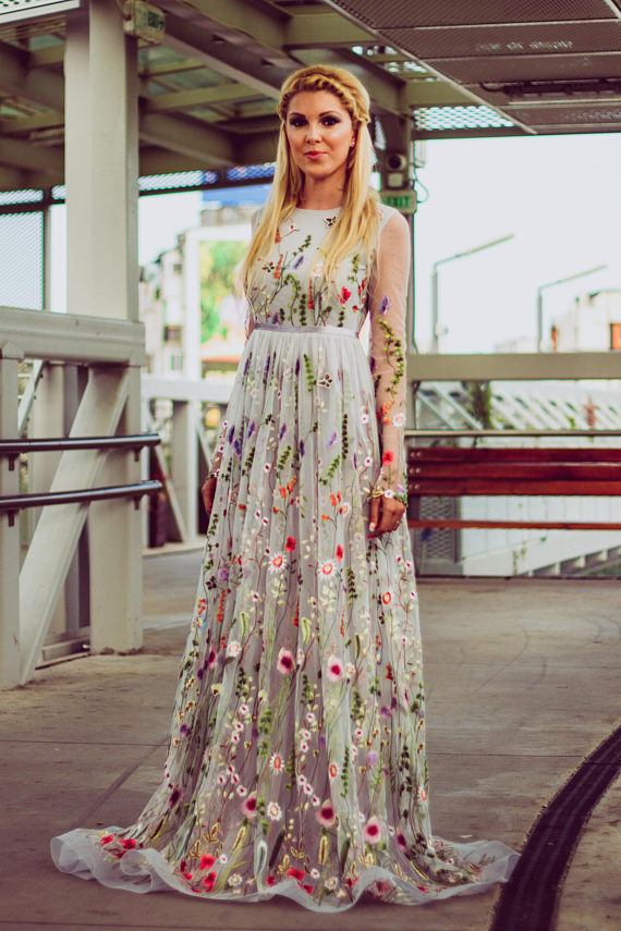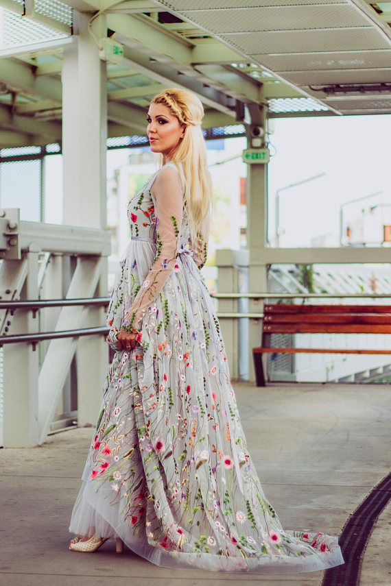 2018 Flower wedding dress in gray, Color wedding dress with sleeves, Bridal dress Long wedding gown in grey, Embroidered wedding dress from tulle