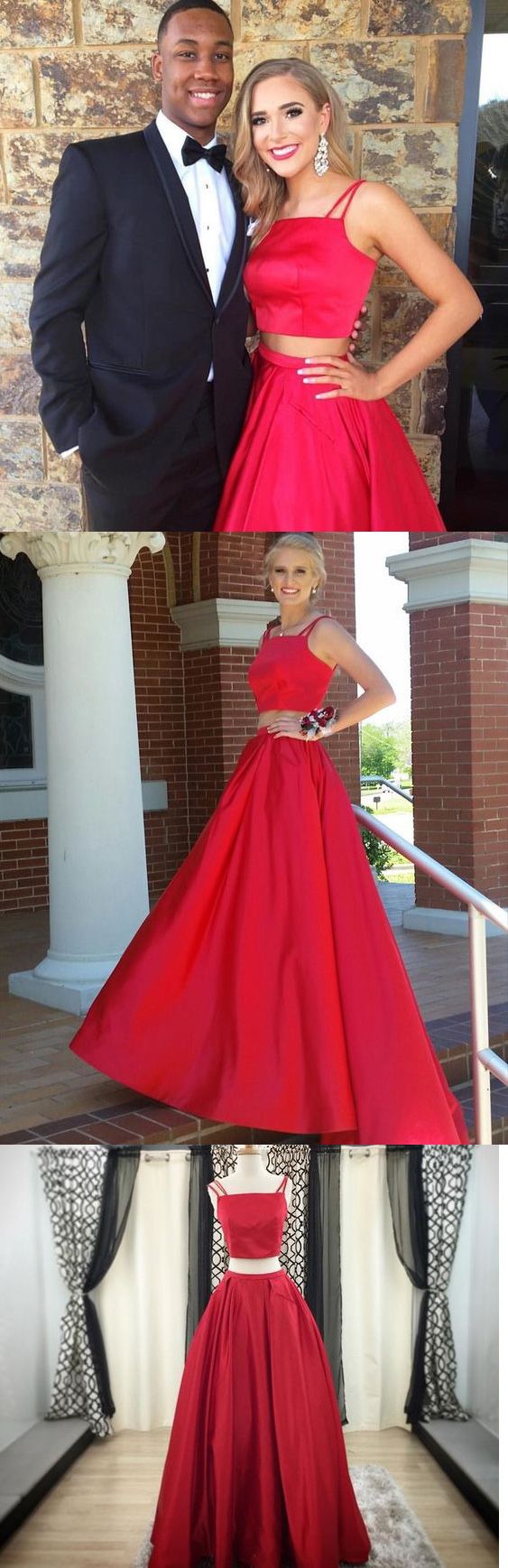 Simple Two Piece Prom Dress, A Line Spaghetti Straps Party Dress, Long Red Satin Evening Dress