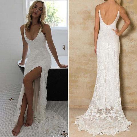 Beach Wedding Dress, Sexy Mermaid Lace Side Split Cheap Long Wedding Dresses