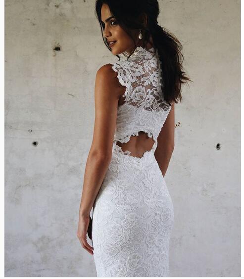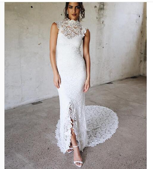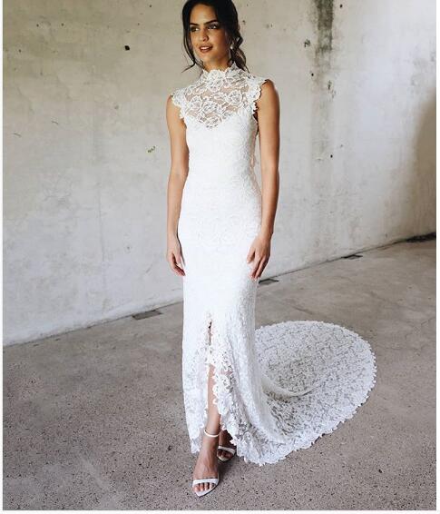2018 Boho Wedding Dress, High Neck Lace Wedding Dress, Long Wedding Dresses Bridal Dress