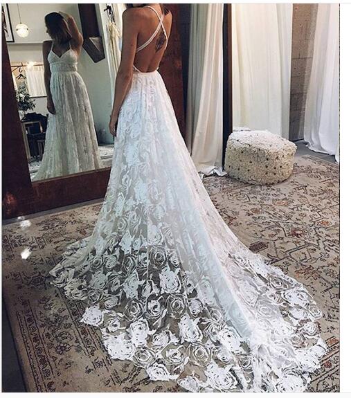 Boho Wedding Dress, Beach Halter Lace Wedding Dress, Long Wedding Dresses,Crisscross Back Bridal Dress