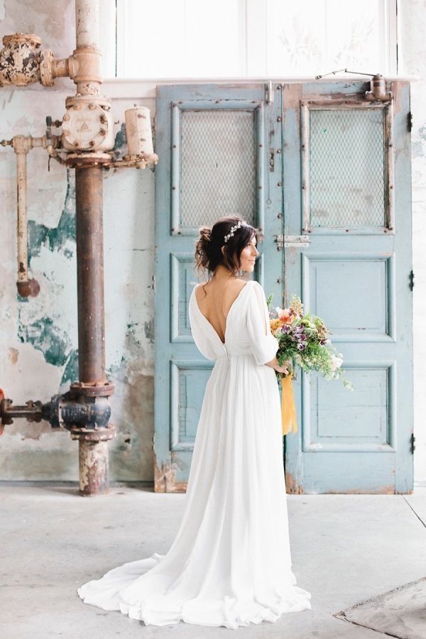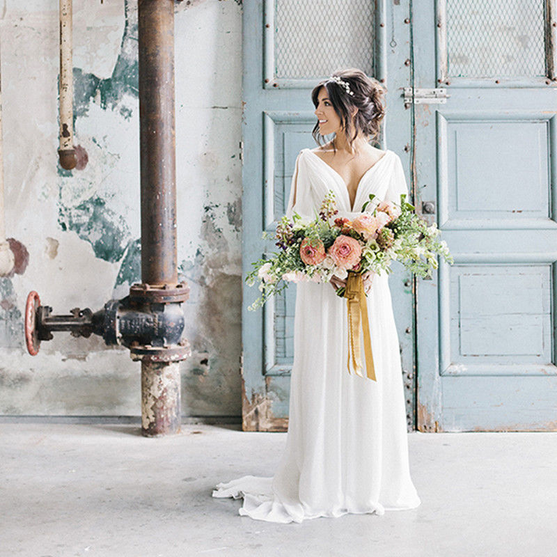 2019 White Boho Wedding Dress, Beach Wedding Dress, Chiffon Wedding Dresses Half Sleeves Open Back Bridal Gown