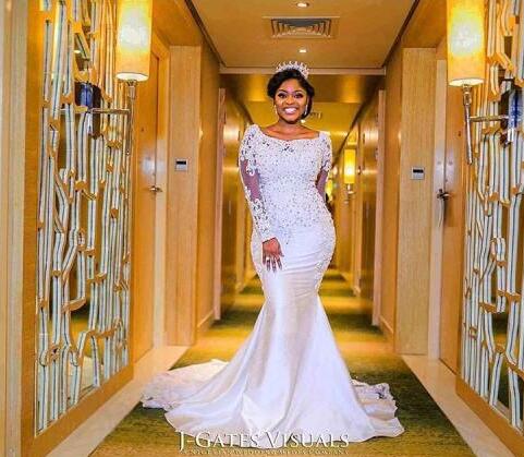 Nigerian Wedding Dresses Sweetheart Neckline with Sheer Lace Appliqued Long Sleeves Chapel Train Length African Black Girl Bridal Gowns