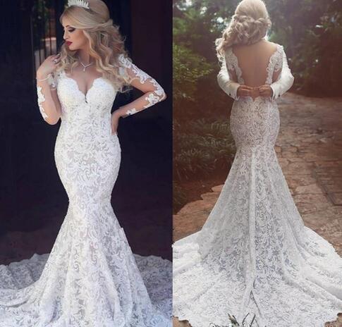 Vintage Full Lace 2019 Wedding Dresses Sexy Open Back V Neck Classic Bridal Gowns Long Sleeves Arabic Dubai Wedding Gowns