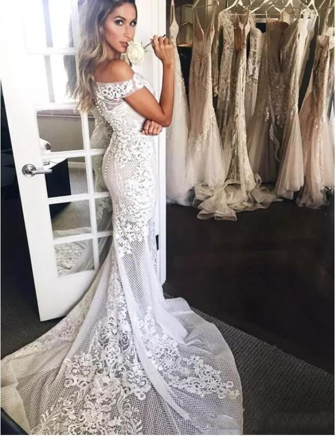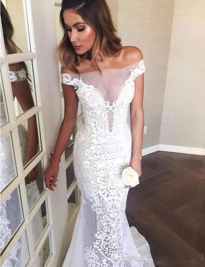 Mermaid Wedding Dresses Off The Shoulder Lace Sheer Sweep Train Wedding Bridal Gowns With Buttons