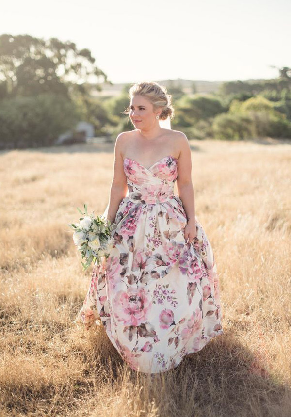 Chic Floral Print Plus Size Wedding Dresses Sweetheart Ruched Bridal Gowns