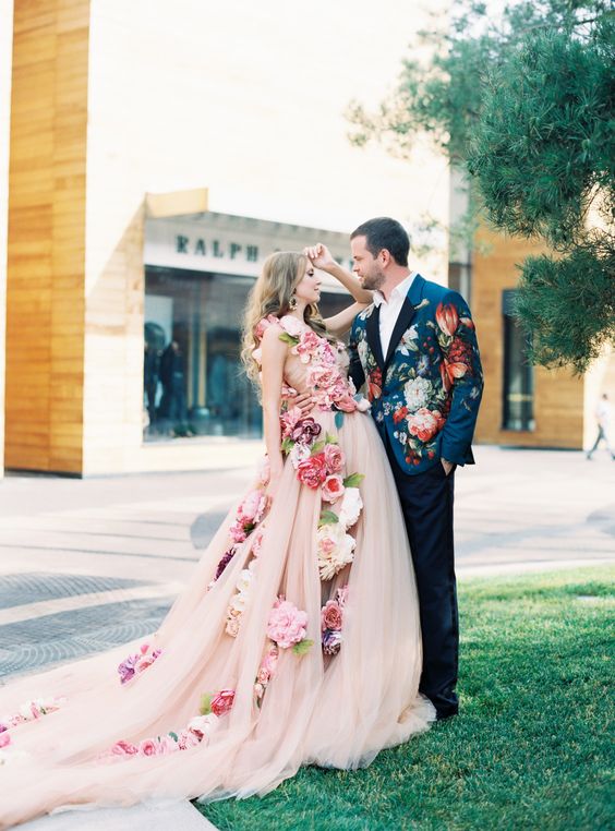 2019 Colorful Flowers Wedding Dress, Ball Gown Long Wedding Dresses, Satin Wedding Gown Bridal Dress