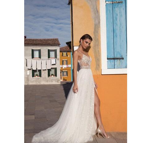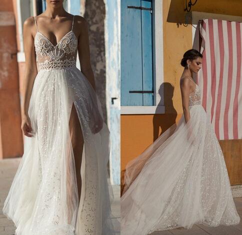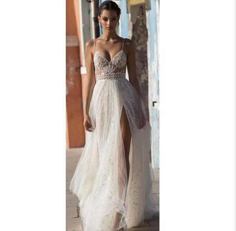 Beach Wedding Dresses Side Split Spaghetti Illusion Sexy Boho Wedding Gowns Sweep Train Pearls Backless Bohemian Bride