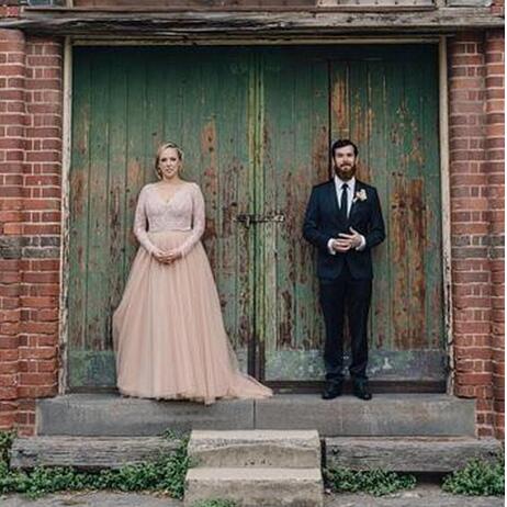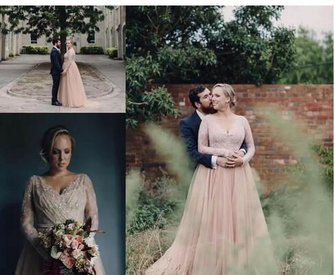Plus Size 2019 New Country A Line Wedding Dresses V Neck Long Sleeves Lace Appliques Beaded Blush Pink Tulle Wedding Gowns Bridal Dress