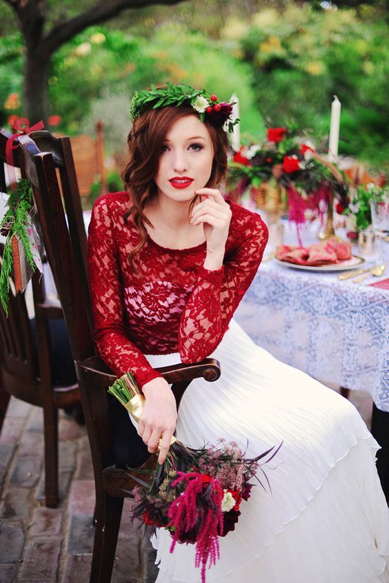 Chic Beach Boho Red and White Wedding Dresses Chiffon Pleat Tiered Bridal Gowns