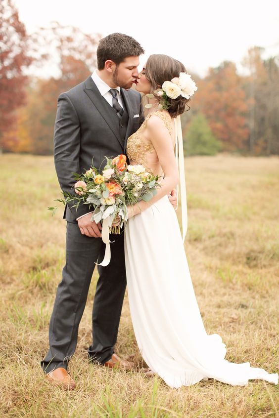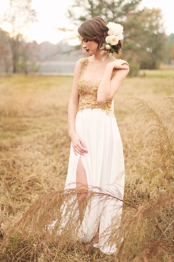 Chic Beach Boho Gold and White Wedding Dresses Lace Bodice Appliques Side Slit Bridal Gowns
