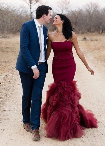 Burgunday Wine Red Mermaid Wedding Dresses Strapless Ruffle Bridal Gowns