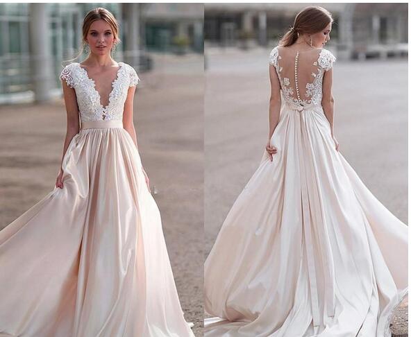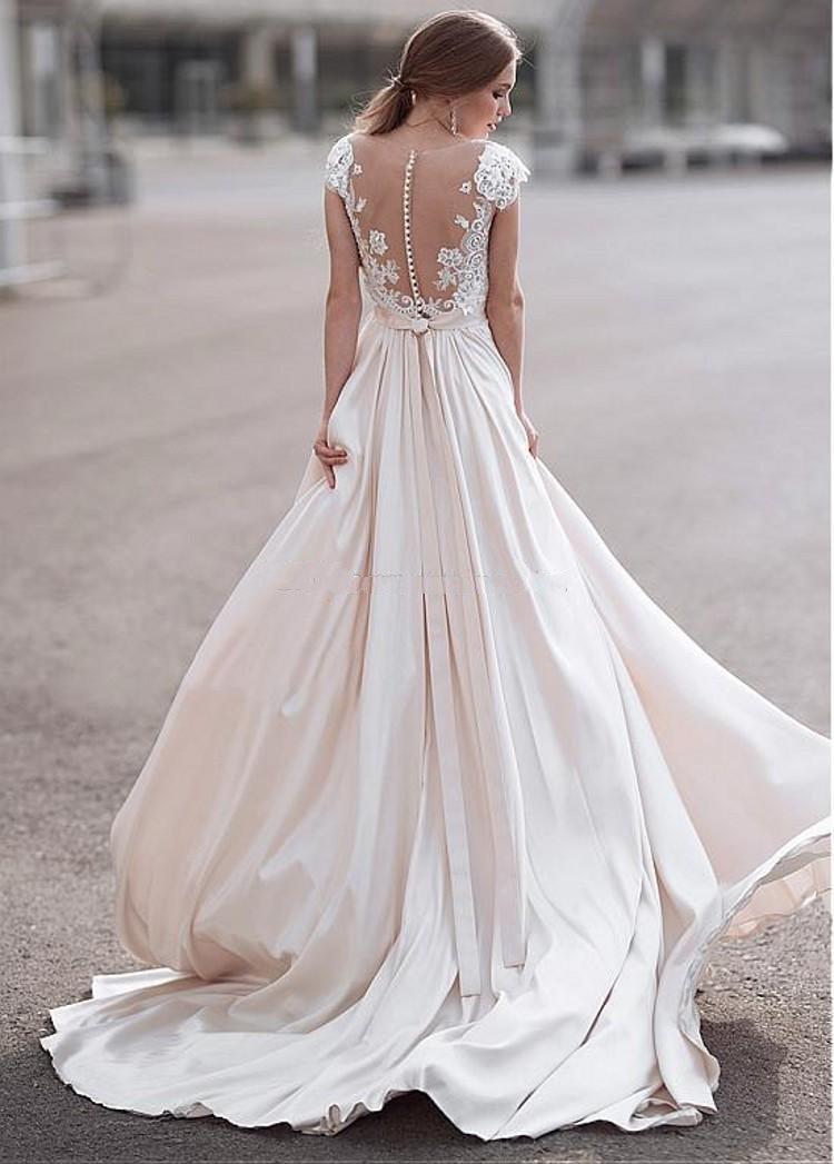 Elegant Light Champagne Wedding Dresses Sheer Neck Cap Sleeves Appliques Illusion Back Satin Wedding Dresses Long Bridal Dresses