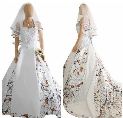 2019 New Fashion White Camo Satin Wedding Dress Custom Lace Appliques Bridal Gowns Lace Up Back With Veil Custom Long Camouflage New