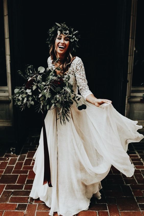 Boho Long Sleeve Wedding Dresses, Lace Bodice Chiffon Wedding Dress, Bridal Dress Wedding Gown