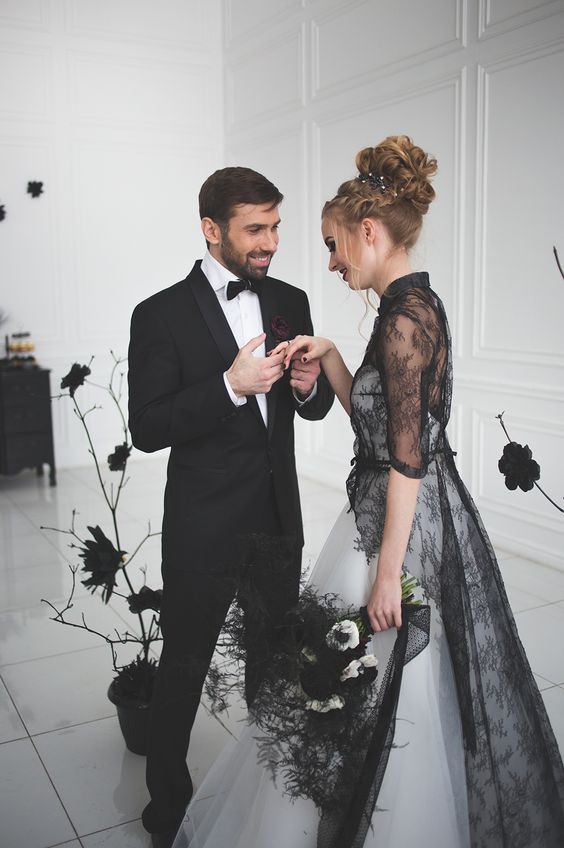 Vintage Black and White A Line Tulle Wedding Dresses Lace Ball Gown Sheer Half Sleeve Bridal Gowns