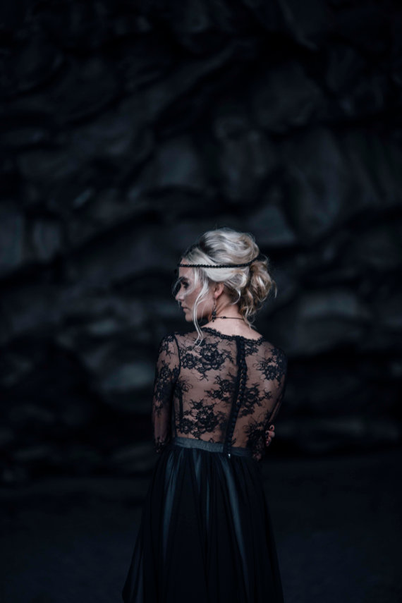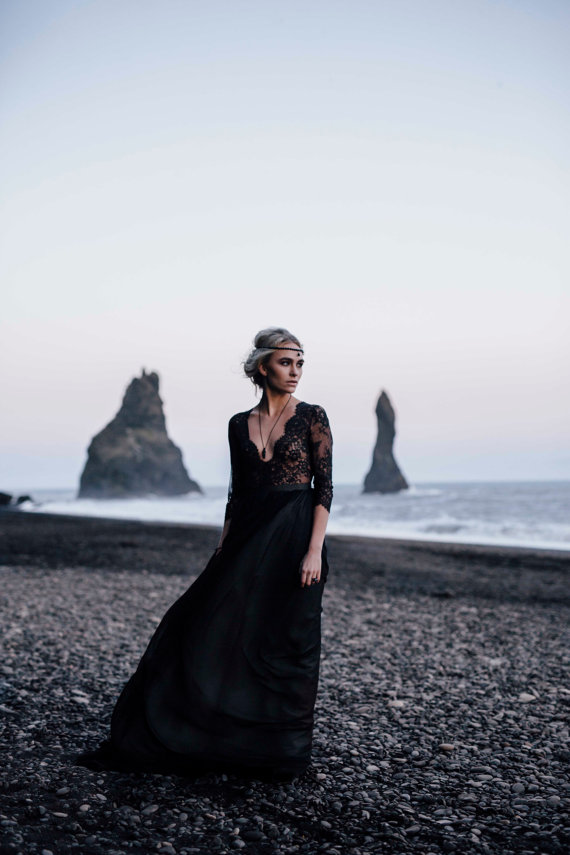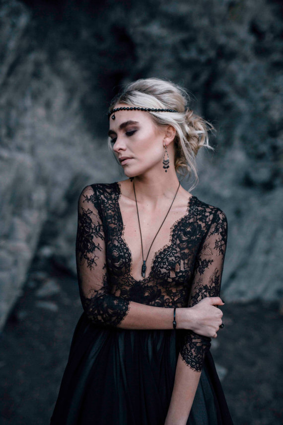 Black lace deep v-neck wedding dress with long sleeve scalloped bodice