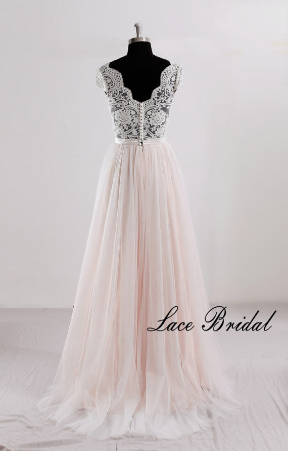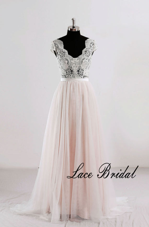 A Line Lace Wedding Dress with Cap Sleeves V Neckline Wedding Dress with Tulle Skirt