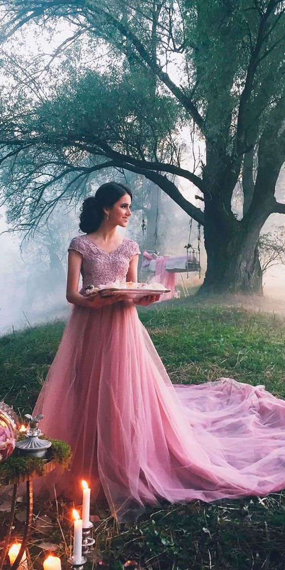 Light Purple A Line Tulle Garden Wedding Dresses Cap Sleeve Bridal Gowns Evening Prom Gowns