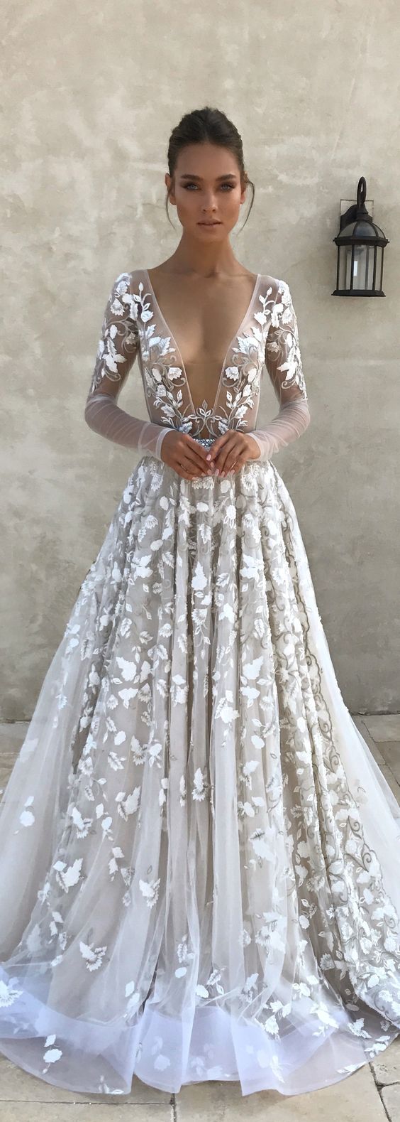 Stunning Luxury Sexy Tulle Wedding Dresses Sexy Deep V Neck Sheer Long Sleeve Appliques Embroidery Bridal Gowns