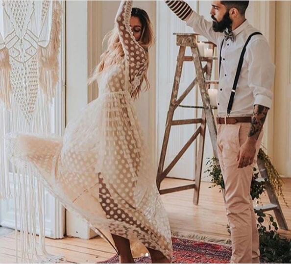 A Line Tulle Dotted Lace Wedding Dresses Simple Sheer Long Sleeve Bridal Gowns