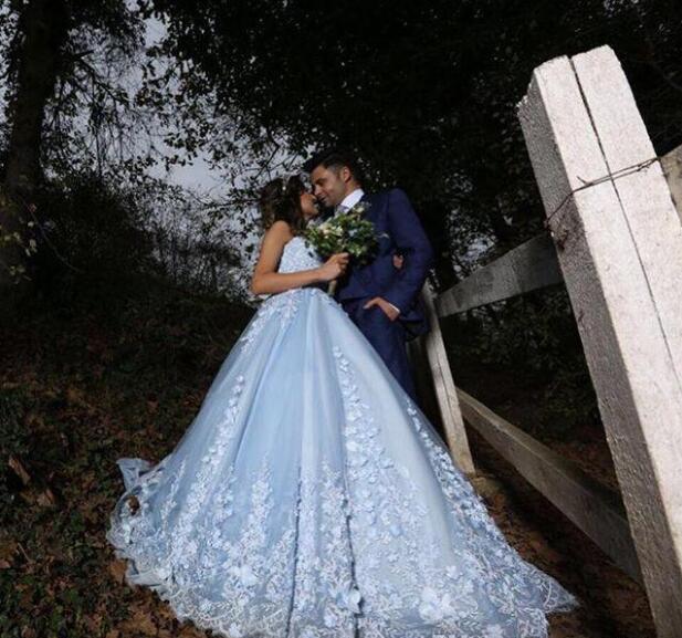 Elegant Light Sky Blue A Line Wedding Dresses Strapless Lace Appliques 3D Flora Sweep Train Boho Chic Garden Wedding Dresses Bridal Gown