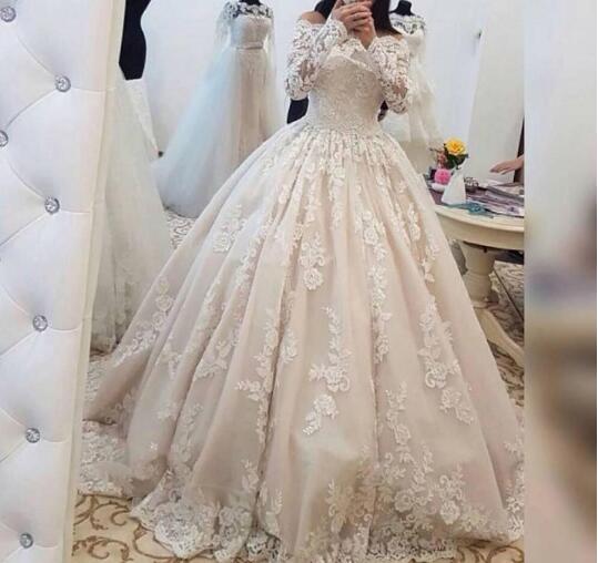 Lace Ball Gown Wedding Dresses With Long Sleeves Custom Made 2019 Lace Applique Off the Shoulder Bridal Wedding Gowns