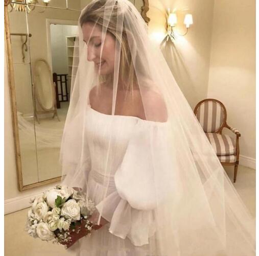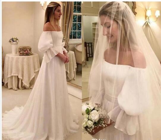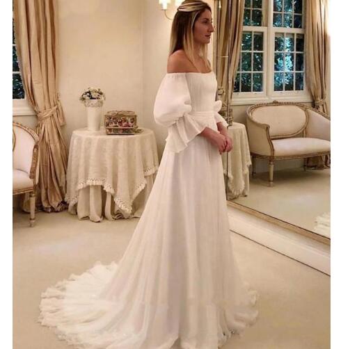 Vintage Beach A Line Wedding Dresses Off Shoulder Chiffon Bridal Gowns Juliet Sleeve Backless Sweep Train Wedding Gowns