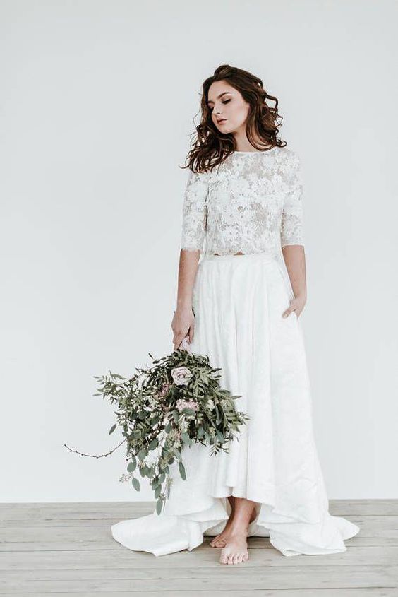 Boho Two Pieces Wedding Dresses Garden Short Sleeve Lace Bridal Gowns