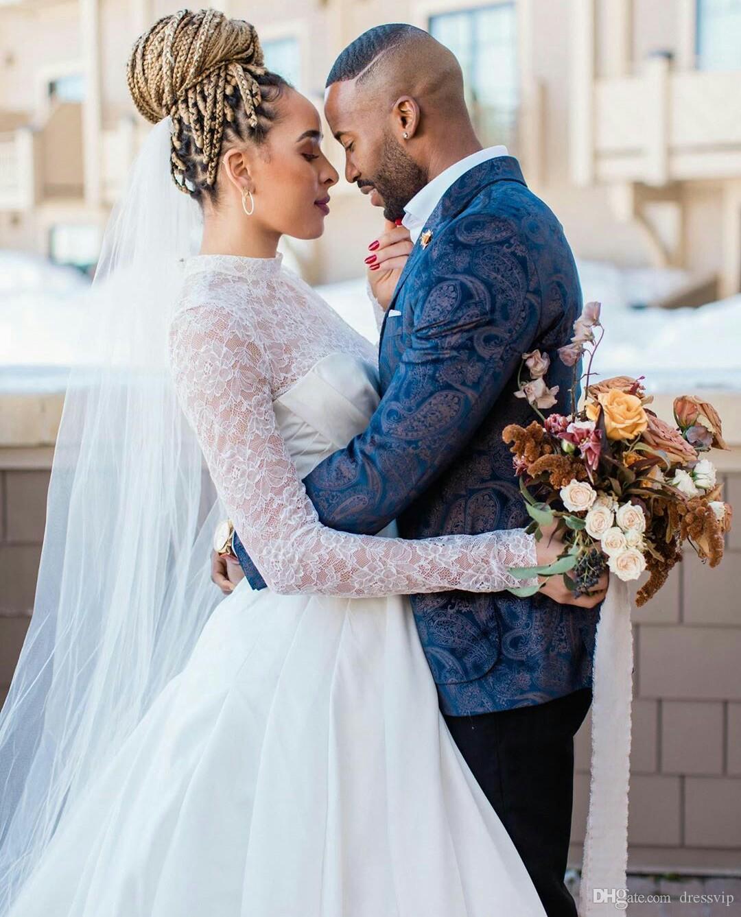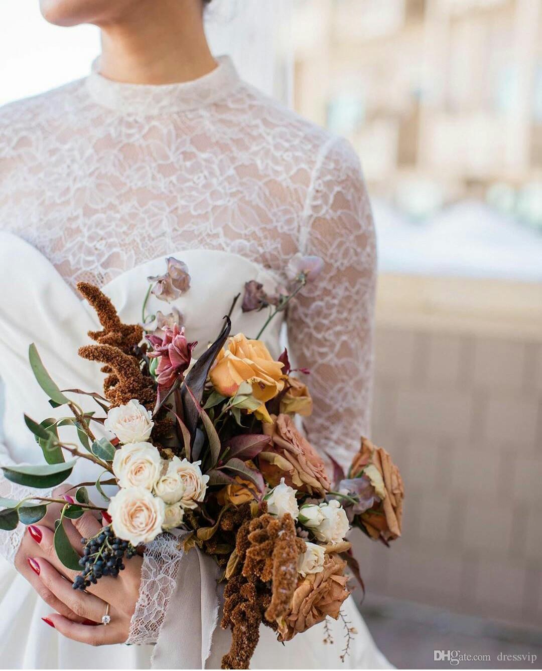 Elegant Beach Wedding Dresses High Lace Neck A Line Satin Long Sleeve Country Wedding Dress Custom Made Sweep Train Vestidos De Novia