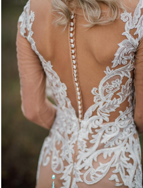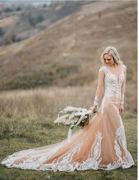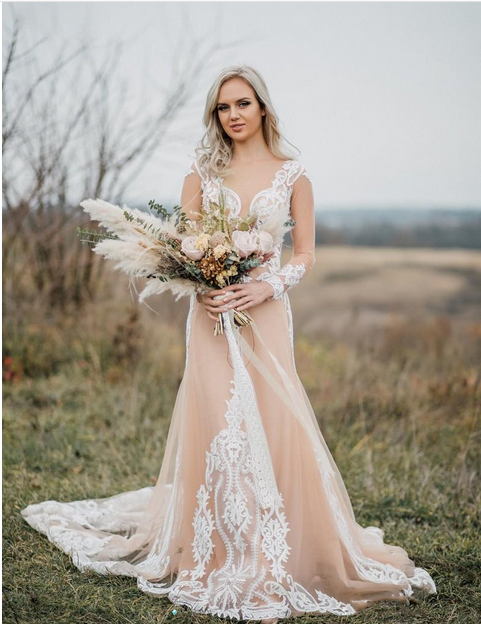 Champagne White Wedding Dresses A Line Appliques Lace Bridal Gowns Wedding Gowns Country Style Long Sleeves Custom Made Plus Size
