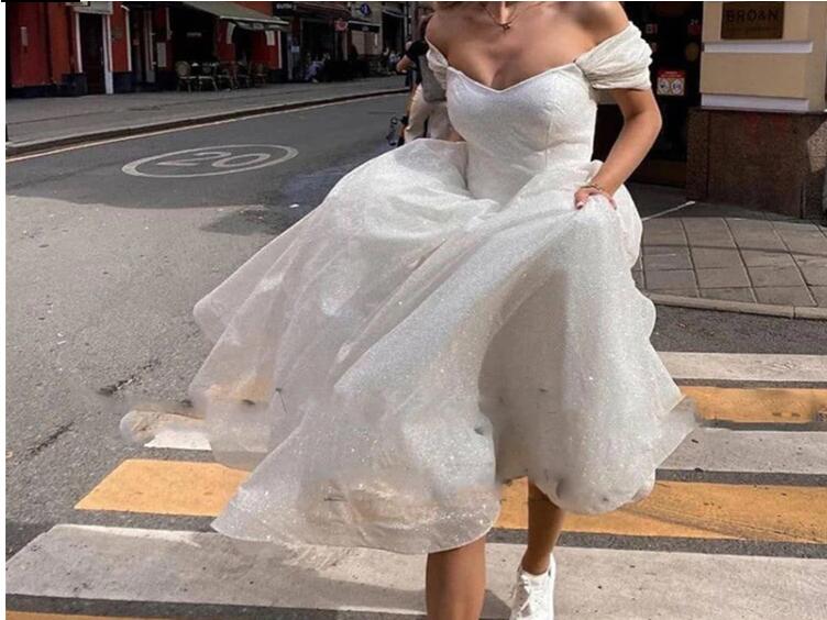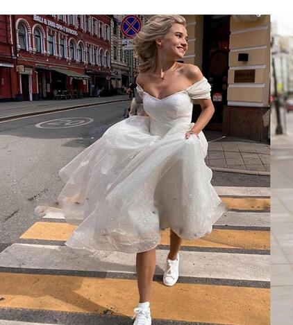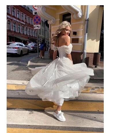 Elegant Ankle- Length Short Wedding Dresses Boho White Ivory Tulle Satin Beach Robe De Mariee Princess Tiered Bridal Gowns