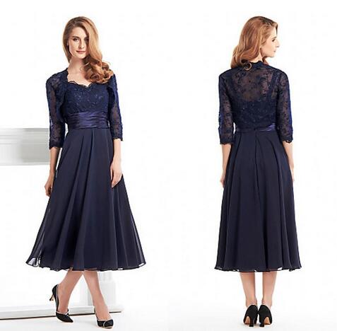 Custom Made Tea Length Mother Of The Bride Groom Dress With Jacket Long Sleeves Navy Blue Lace Plus Size Women Evening Formal Gown