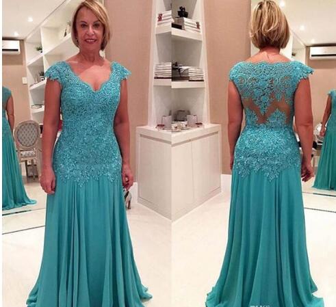 Turquoise Lace Mother of the Bride Dresses Chiffon Mermaid Moms Gowns V-Neck Cap Sleeve Applique Formal Evening Gowns