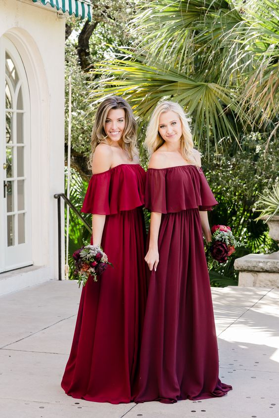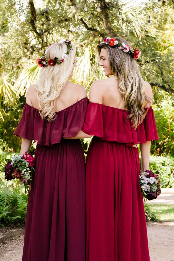 2018 Boho Off the Shoulder Bridesmaid Dress, Burgundy/Red Long Bridesmaid Dress, Chiffon Bridesmaid Dresses