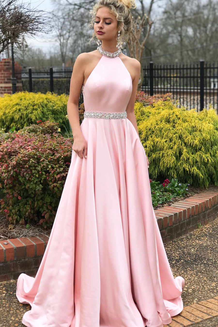 Charming High Neck Pink Beaded Long Prom Dress,Open Back Evening Dresses