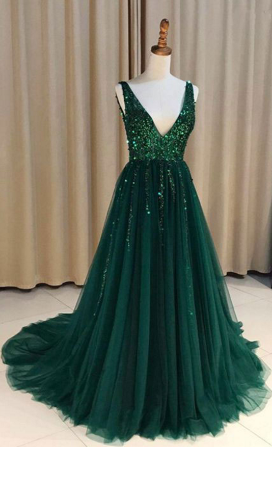 Special V Neck V Back Tulle Green Long Prom Dresses with Sequined for Women Evening Formal Gowns