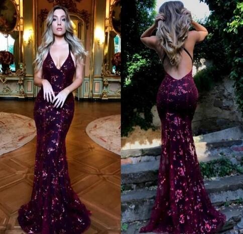 Unique Design Mermaid Grape Sequin Evening Dresses Sexy Deep V Neck Backless Prom Gowns Popular Party Gowns Customize