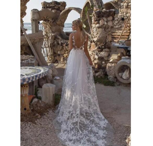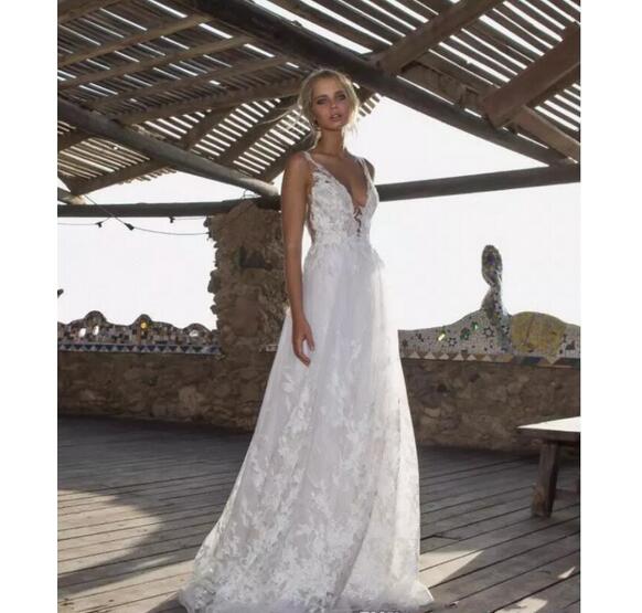Marvous A Line Tulle Wedding Dresses Sexy Deep V Neck Lace Appliques Sheer Back Bridal Gowns