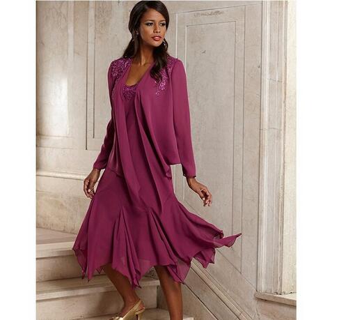 Vintage Elegant Chiffon Plus Size Mother Of The Bride Dresses With Jacket Tea Length Groom Pant Suits Gowns For Weddings