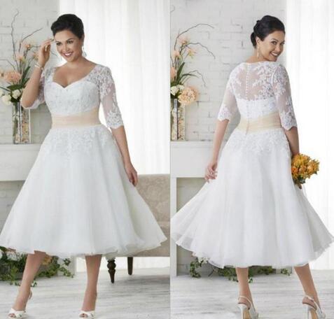 Plus Size Wedding Dresses With Half Sleeves A Line V Neck Ball Gowns Vintage Tea Length Wedding Dress Colored Wedding Bridal Gowns