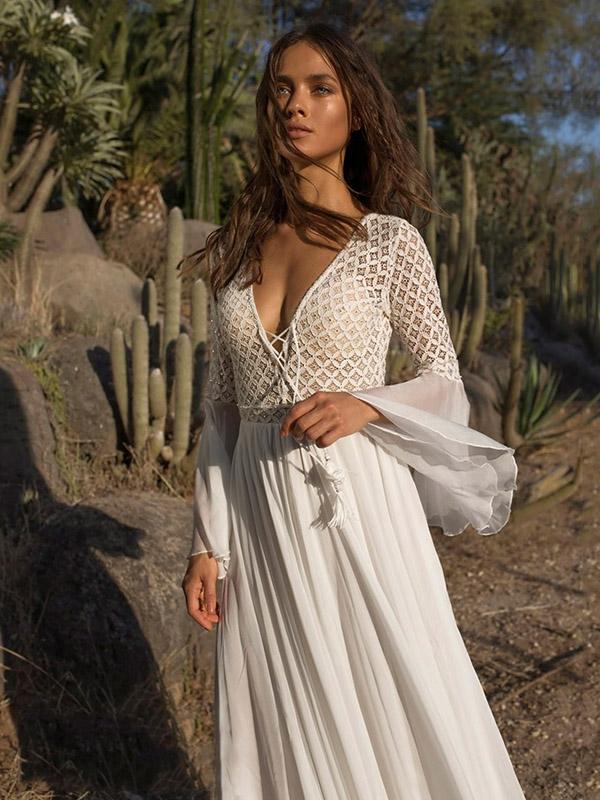 Boho Simple A Line Chiffon Wedding Dresses Sexy Deep V Neck Poet Sleeve Pleat Bridal Gowns