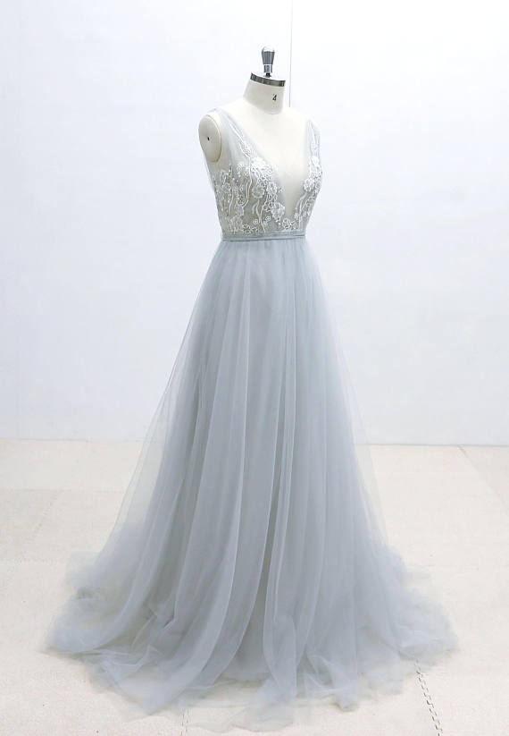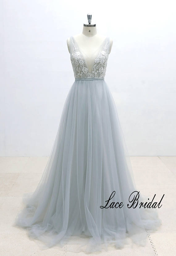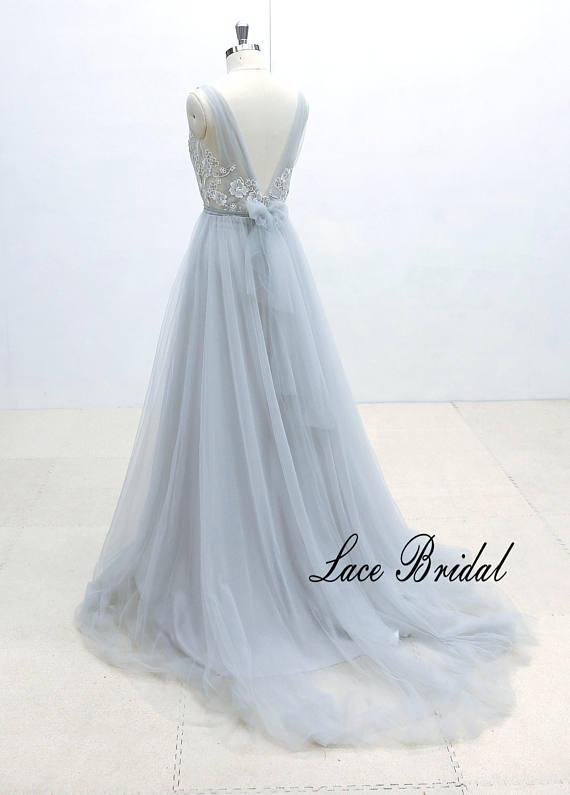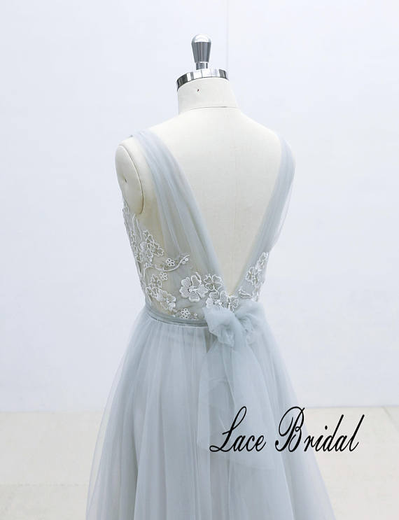 Ivory Lace Wedding Dress with Silver Thread Binding Dusty Blue Airy Tulle Wedding Dress with Deep V Neckline