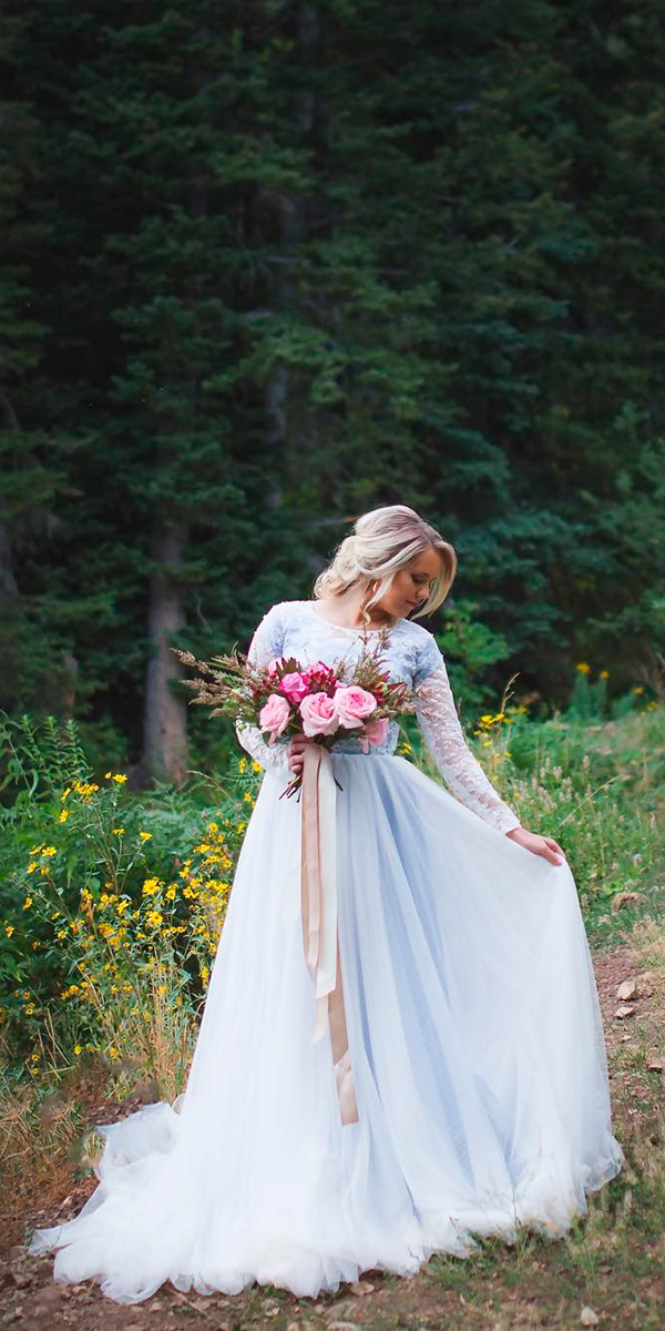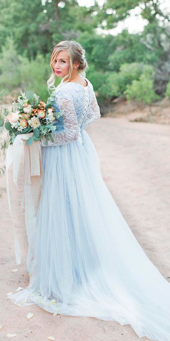Light Blue A Line Tulle Wedding Dresses Sheer LOng Sleeve Lace Up Bridal Gowns