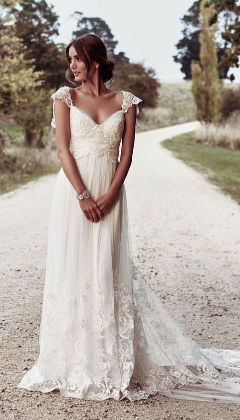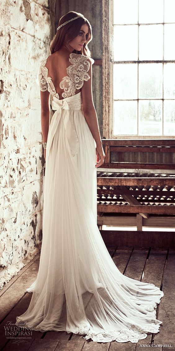 Boho Bohemian A Line Chiffon Wedding Dresses Cap Sleeve Lace Accents Big Bow Bridal Gowns