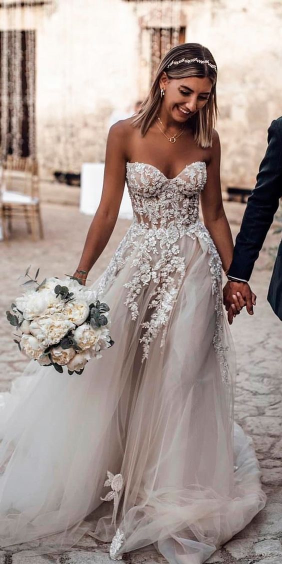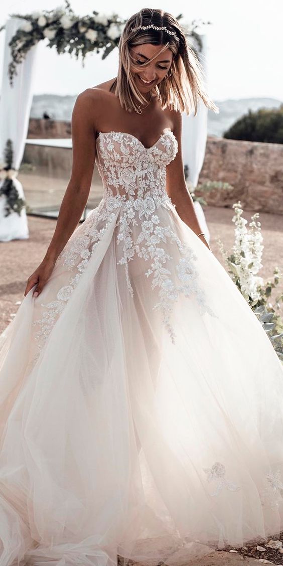 Ball Gown Tulle Light Grey Boho Wedding Dresses Sweetheart Appliques Bridal Gowns