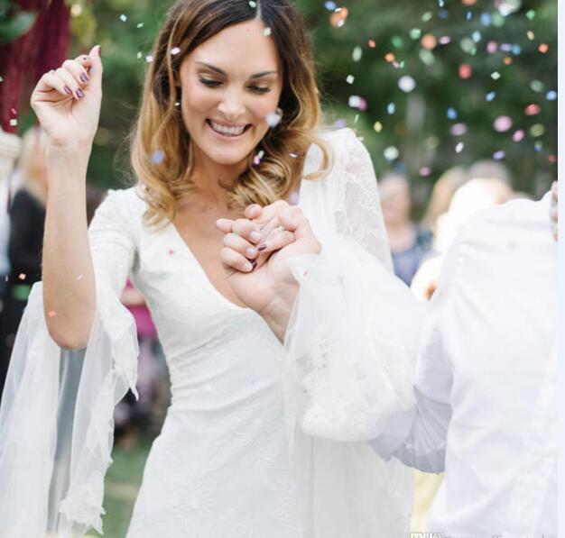 Lace Deep V Neck Beach Boho Wedding Dresse Long Sleeve with Ribbon Open Back vestidos de novia Bohemian Bridal Gown Country Bride Dress