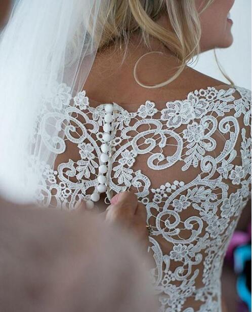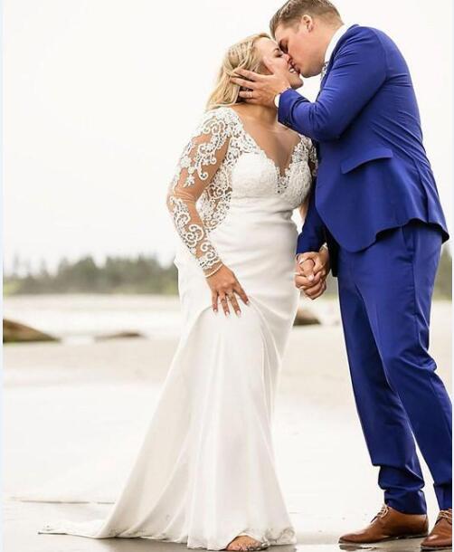 Mermaid Plus Size Wedding Dress Crew Neck Covered Button Sweep Train Stain Applique Illusion Long Sleeve Vestidos De Noivia Bridal Dress